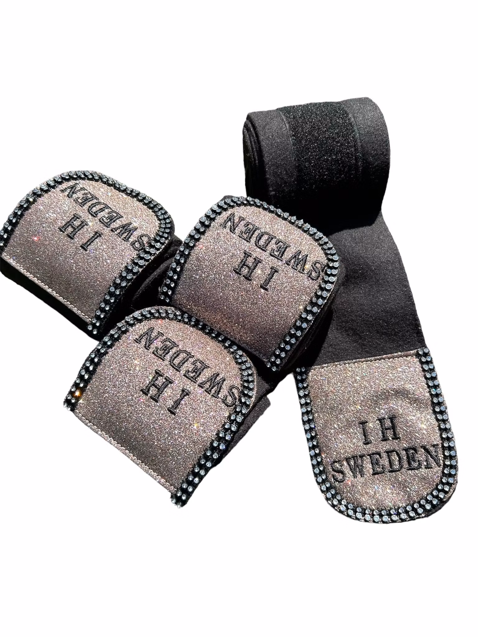 IH collektion i färgen Champagne.Benlindor i svart fleece med glitter och dubbel strassrad.
