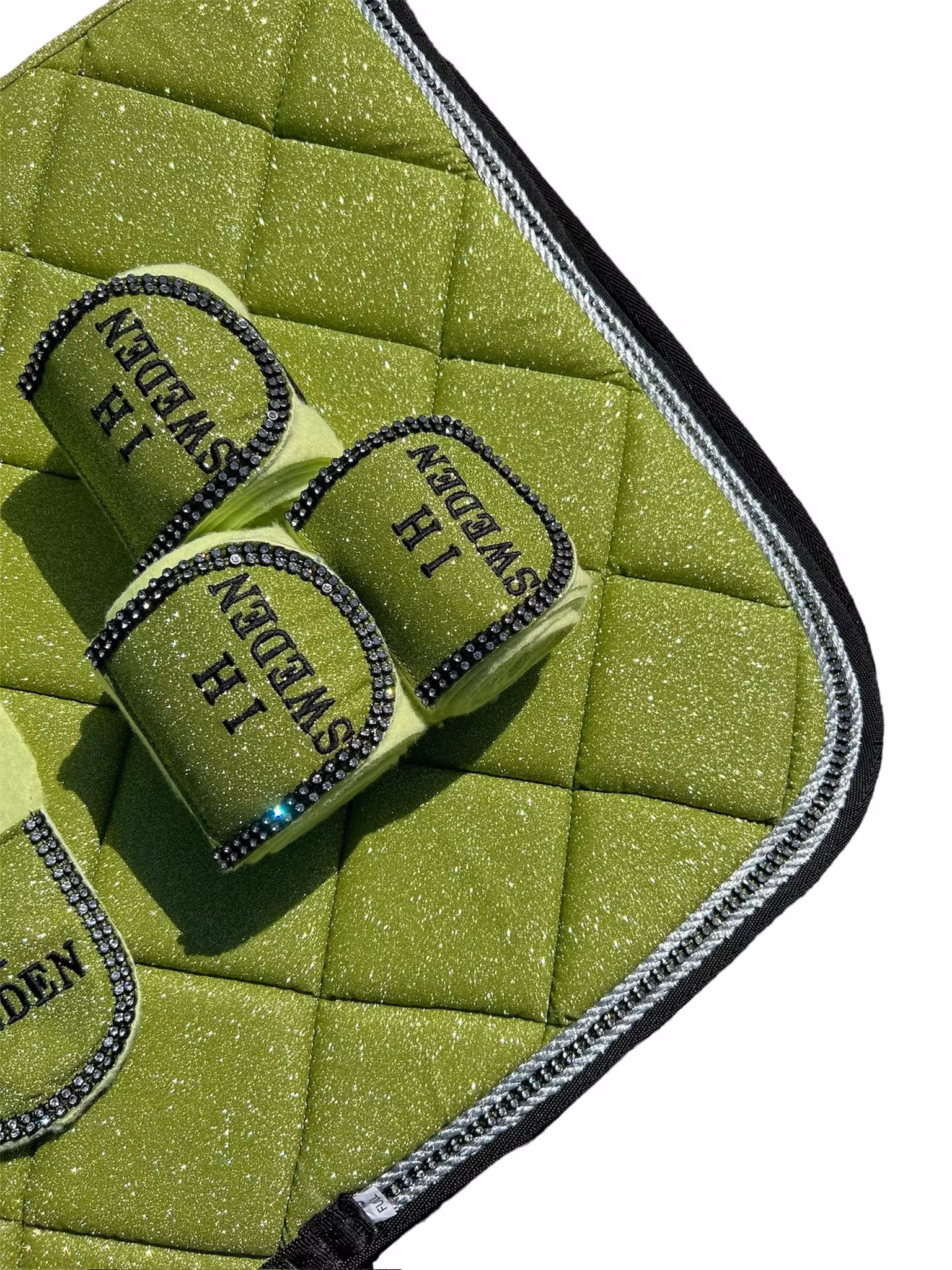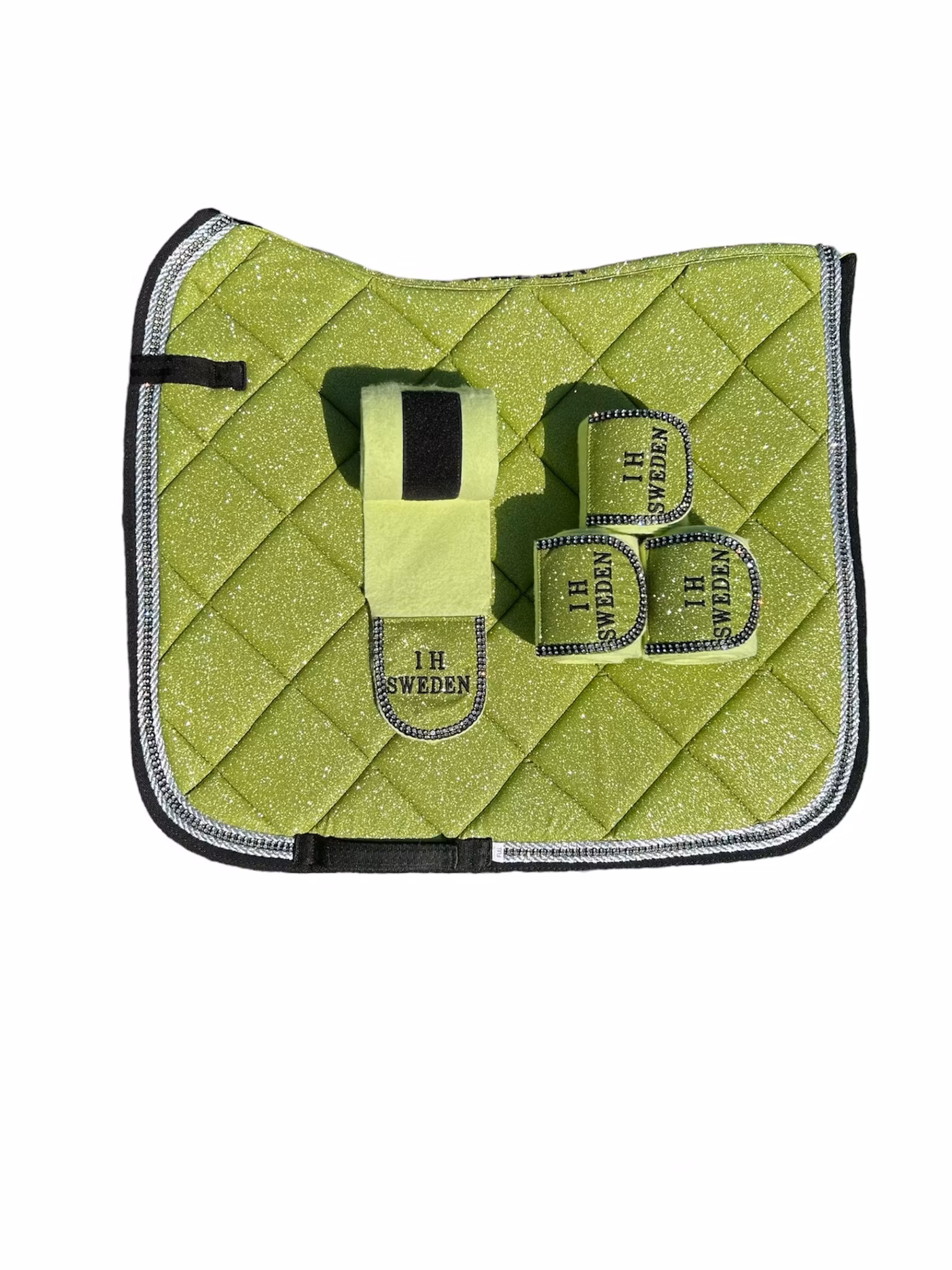 IH collection dressyrschabrak i färgen Lime.Glitter och dubbel strassrad.Benlindor i fleece.