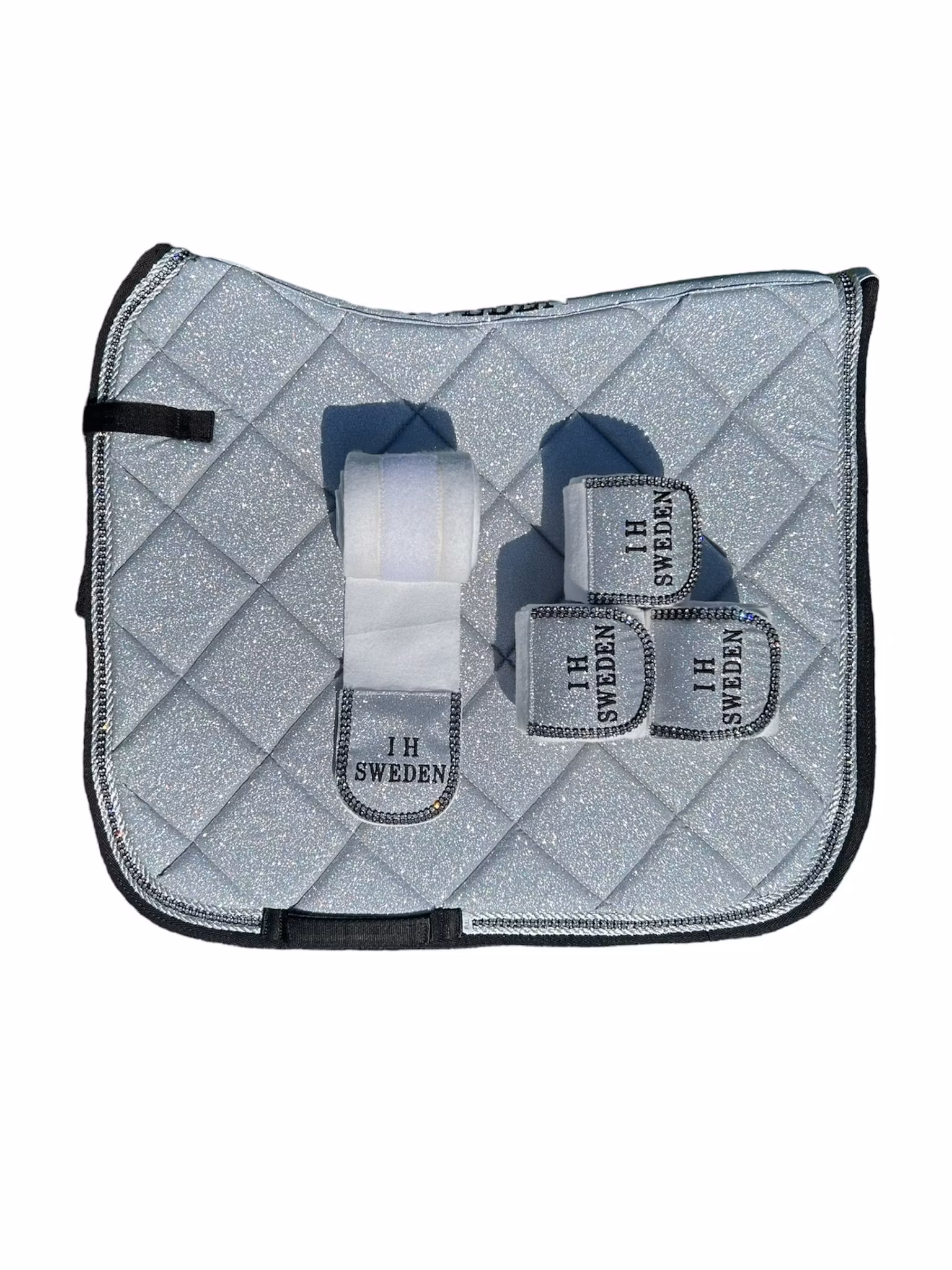 IH collektion dressyrschabrak i färgen silver.Benlindor i vit fleece.Glitter och dubbel strassrad.